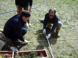 | ホースを利用して水平を計ります | 糸を張り幅の確認 | ひたすら掘ります | 午前の成果 | |||
