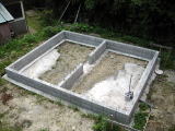 | 空き地 | 溝を掘り | 鉄骨を入れ | 第一次生コン | ブロック | 第二次生コン 完成! |